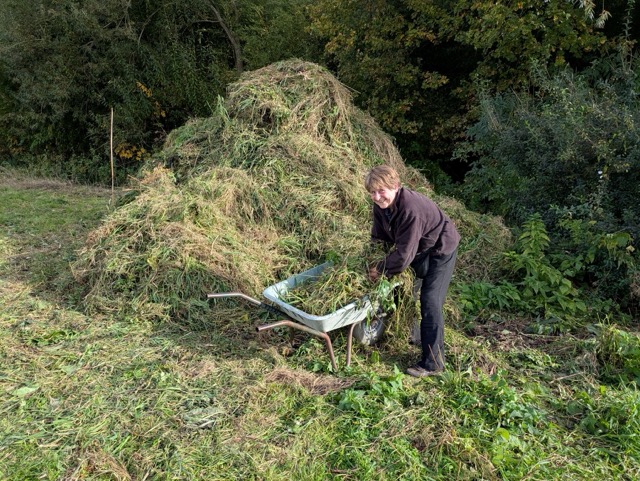 Na het maaien is het maaisel ‘op ril’ gelegd met de Acrobaat achter de trekker (die hadden we al sinds 2019). Vervolgens heeft de werkgroep Natuurlijk Tuinieren twee zaterdagen keihard gewerkt om al het maaisel op hopen te harken en te verzamelen (ook langs de paden A, B en D is een groot deel gemaaid, de rest gaat de bosmaaiploeg doen).
