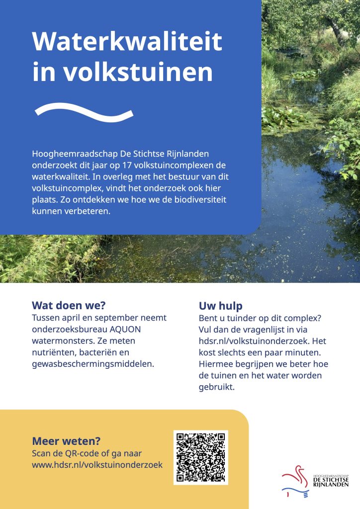 Hoogheemraadschap De Stichtse Rijnlanden wil graag ontdekken hoe de biodiversiteit kan verbeteren en onderzoekt daarom dit jaar op 17 volkstuincomplexen de waterkwaliteit. In overleg met het bestuur, vindt het onderzoek ook bij ons plaats.